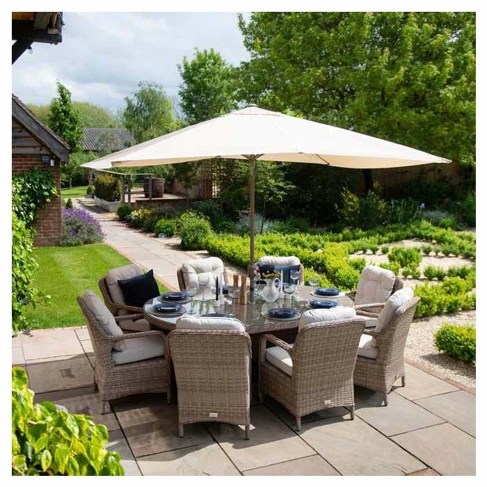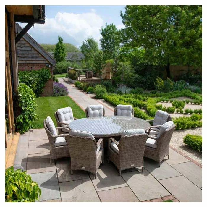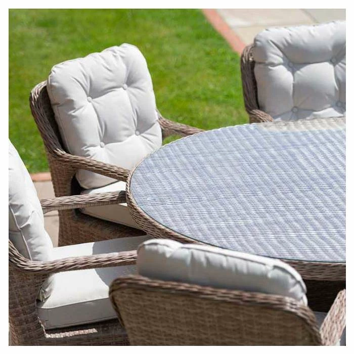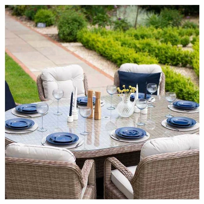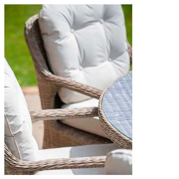 Versatile and multifunctional, transform your outdoor areas into modern living spaces with this classic dining set. The deep seated chairs feature wide armrests and curved backs which are ergonomically designed, paired with the thick and comfy cushions, so you can truly relax into uncompromising outdoor comfort and support. This premium dining set lets you entertain or relax outside morning, noon and night and in any season, giving you the best year-round outdoor living set up.