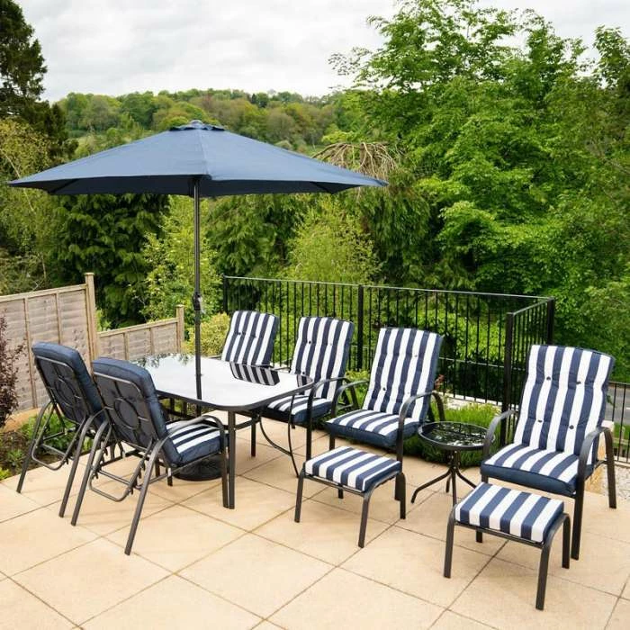 This brilliant six seater garden dining set is perfect for enjoying a big family lunch in the sunshine. This set comes with two extra stools which are incredibly useful for accommodating any extra guests and for saving space. With a fantastic high quality parasol that comes with its own crank you can enjoy spending time in your garden without having to worry about the harsh heat. The gorgeous reversible cushions are thick, luxurious and highly versatile. Made from extremely durable powder coated steel this dining set has excellent resistance to adverse weather conditions and is easy to put together.