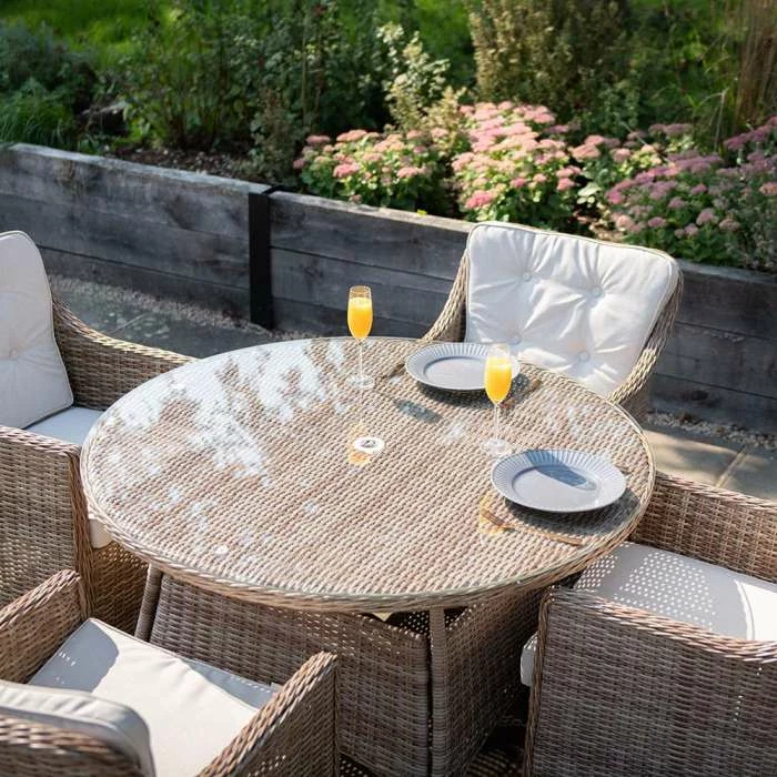 This premium dining set lets you entertain or relax outside morning, noon and night and in any season, giving you the best year-round outdoor entertaining set up. Cushion styles may vary.