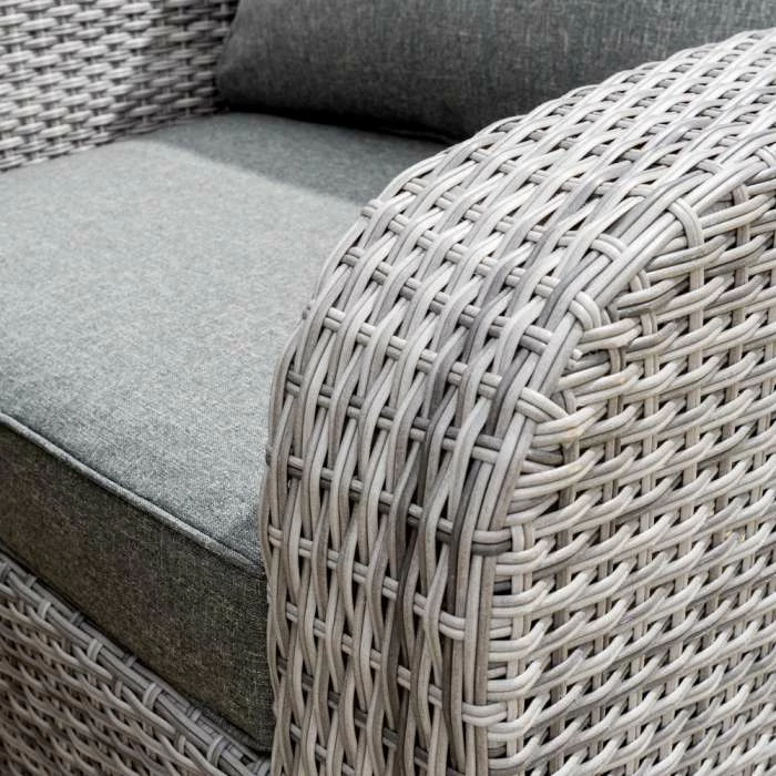The Handpicked rattan Longbeach dining/lounge set comes in grey. This season’s must have design with deep curved arms and luxurious soft-feel cushions. Complete with 3 Seat Sofa, 2 Armchairs, 2 Stools and a 140x80cm glass-topped high dining table.