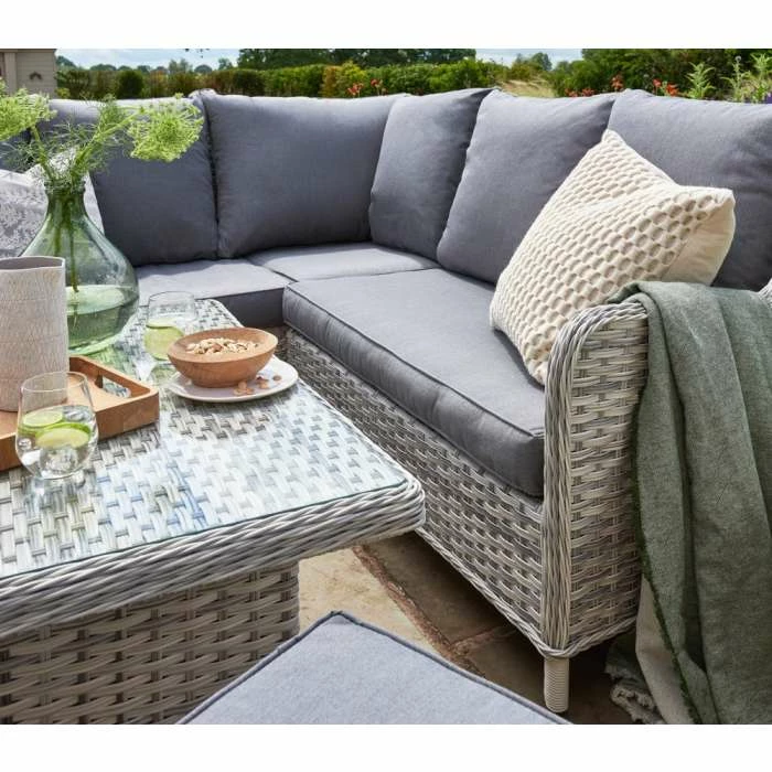 The Wroxham mini corner 6-8 seater lounge/dining set with height adjustable table has been developed with both comfort and style foremost. The high backs are set to the perfect angle with deep seating and soft supporting back cushions. This range is further enhanced by the showerproof cushions, a durable mix of acrylic and polyester with a showerproof coated inner. This range also comes with an extended 5 year warranty. The luxury weave is a beautiful blend of colours in a wide weave, which gives a superior finish to the collection.