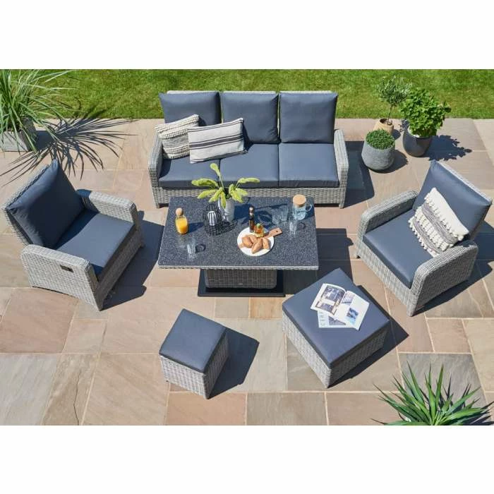 The Hawaii Sofa set consists of a 3 seat sofa, 2 lounge chairs, gas adjustable table, large poof and small stool.
