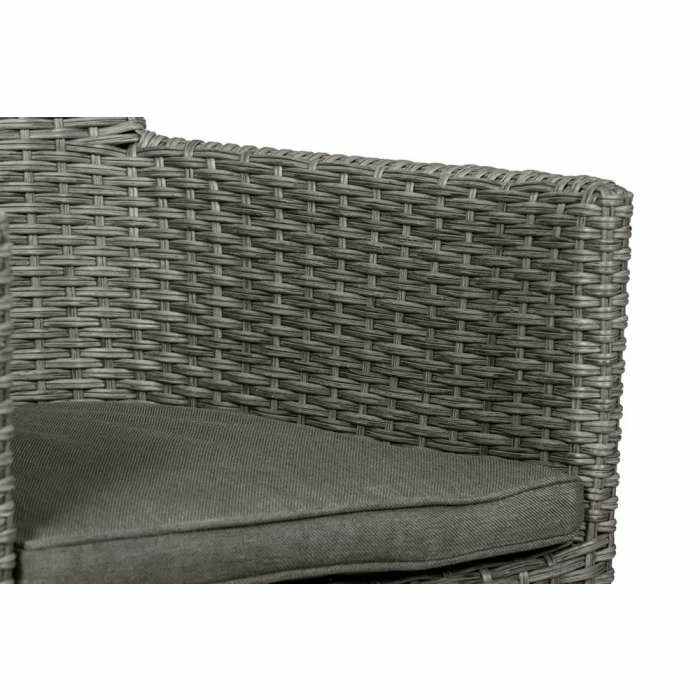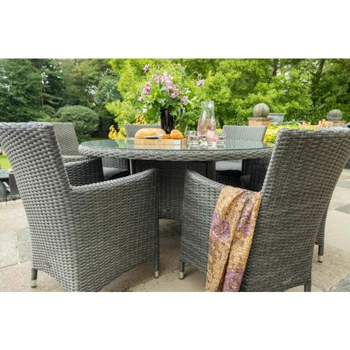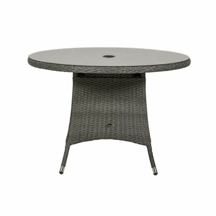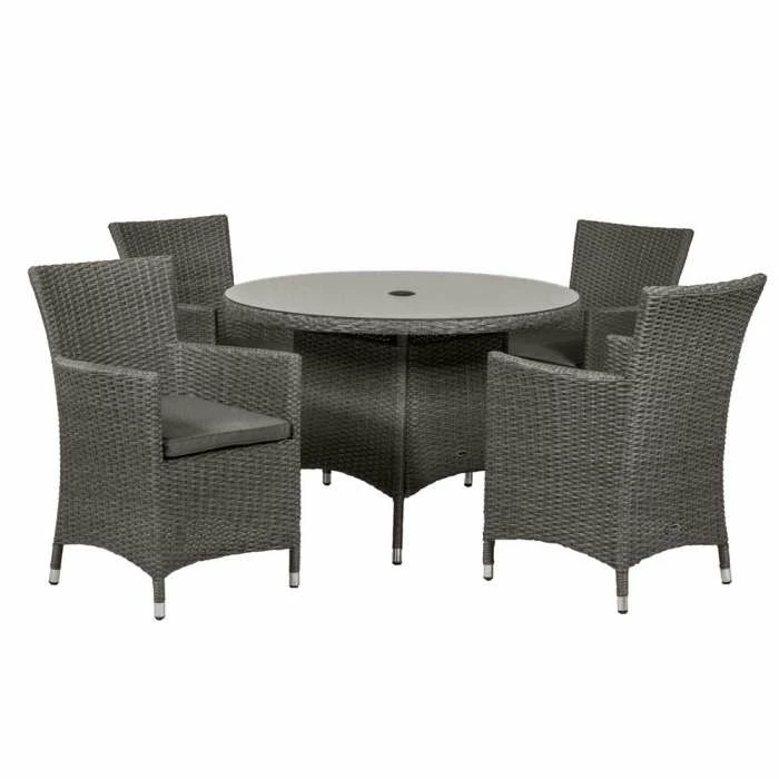 The Paris 4 seater dining set comes complete with 4 fixed carver chairs, with grey seat pads and 110cm floating, tempered glass top table with built in parasol hole. It is the perfect setting for outdoor lunch or dining or to relax with a drink. Made from the highest quality polyethylene double round wicker around a rigid aluminium frame it is durable and weather resistant for use all year round.