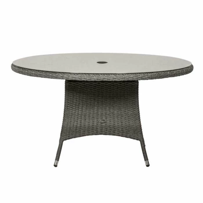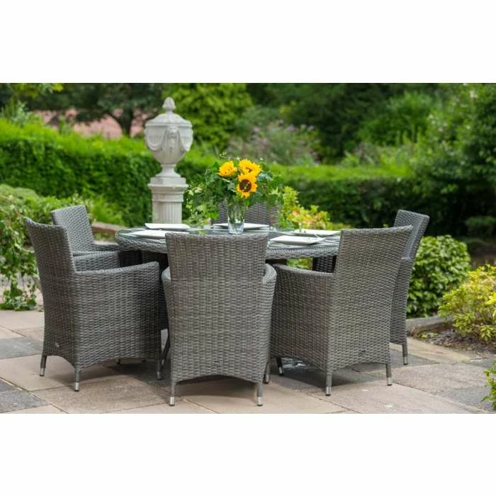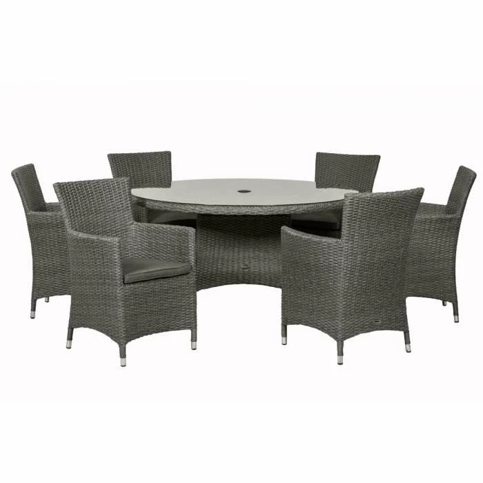 The Paris 4 seater dining set comes complete with 4 fixed carver chairs, with grey seat pads and 110cm floating, tempered glass top table with built in parasol hole. It is the perfect setting for outdoor lunch or dining or to relax with a drink. Made from the highest quality polyethylene double round wicker around a rigid aluminium frame it is durable and weather resistant for use all year round.