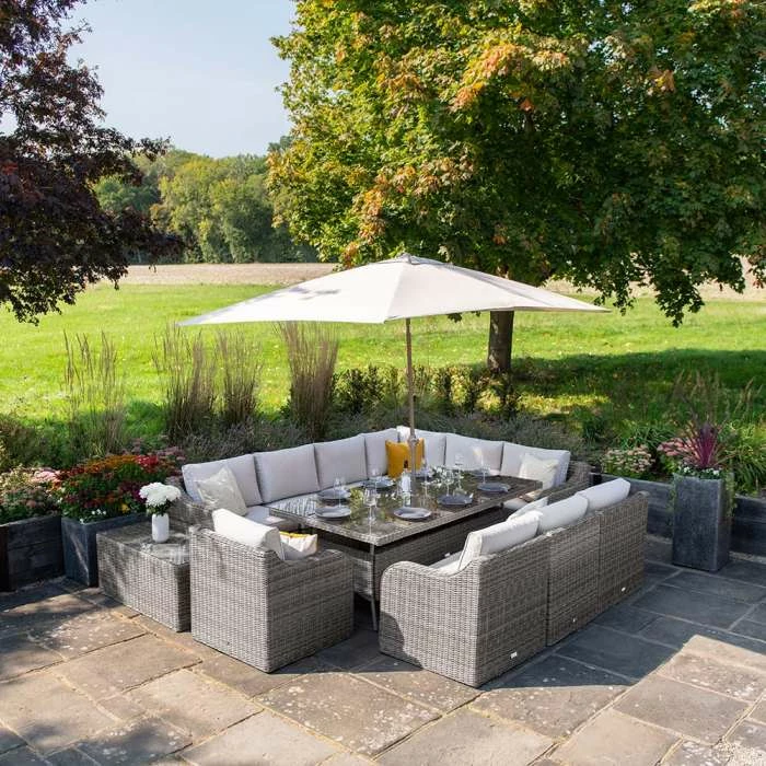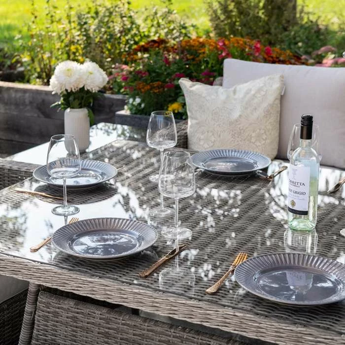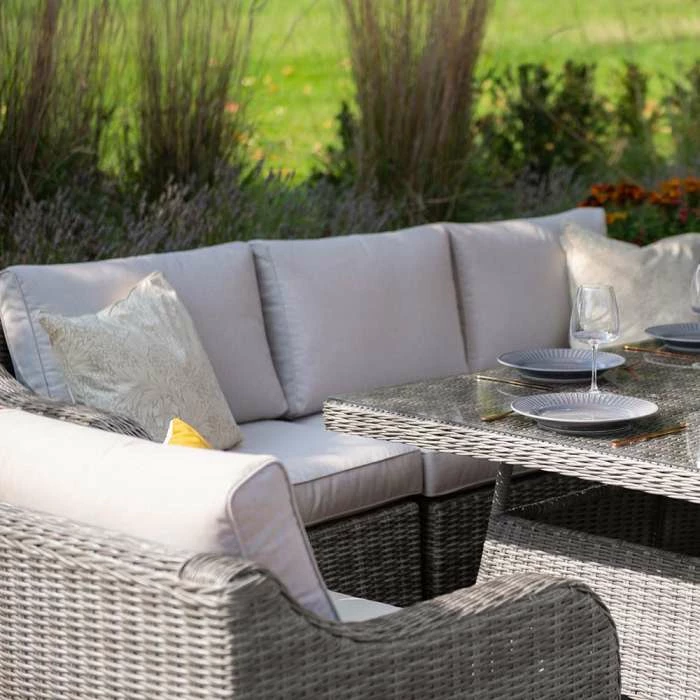 A modular dining set designed for modern outdoor living. The high backed sofa pieces and armchairs are padded with thick, foam-filled cushions that give you unequalled comfort and support.