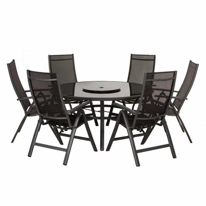 The Sorrento 6 seater set consists of 150cm round anthracite table with tempered glass table top, complete with lazy Susan and 6 anthracite frame all-weather Taupe textylene recliner chairs. This is a practical but stylish garden furniture set that will be functional year after year.