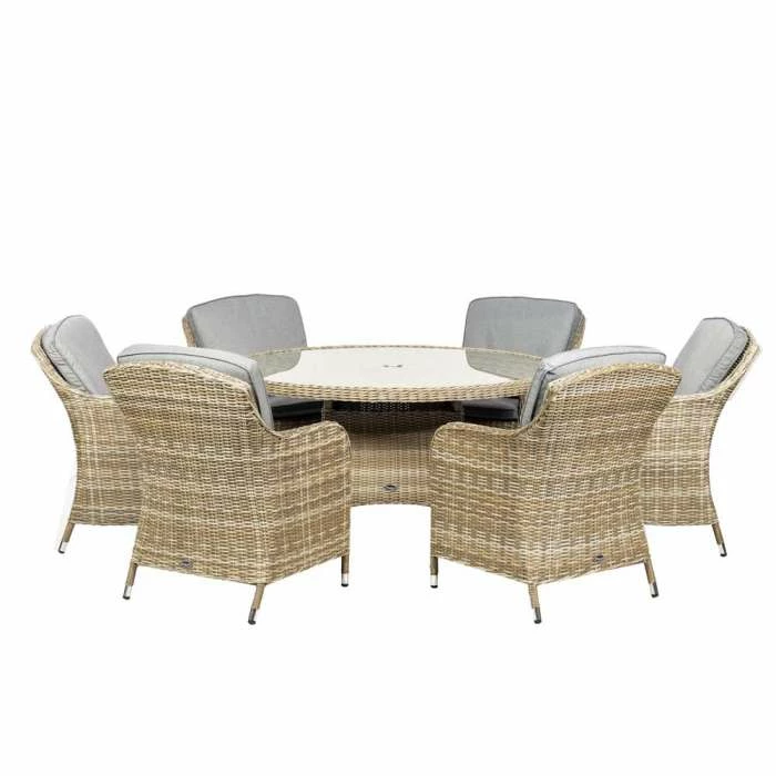 The Wentworth 6 seater imperial dining set is the perfect addition to your outdoor space with its timeless design. Retaining classic style with its aluminium framework construction and hand woven synthetic half round weave rattan it offers style, comfort, strength and durability. Complete with 140cm round tempered glass top table and six imperial chairs including seat cushions, it is perfect for use all year round and will provide years of enjoyment.